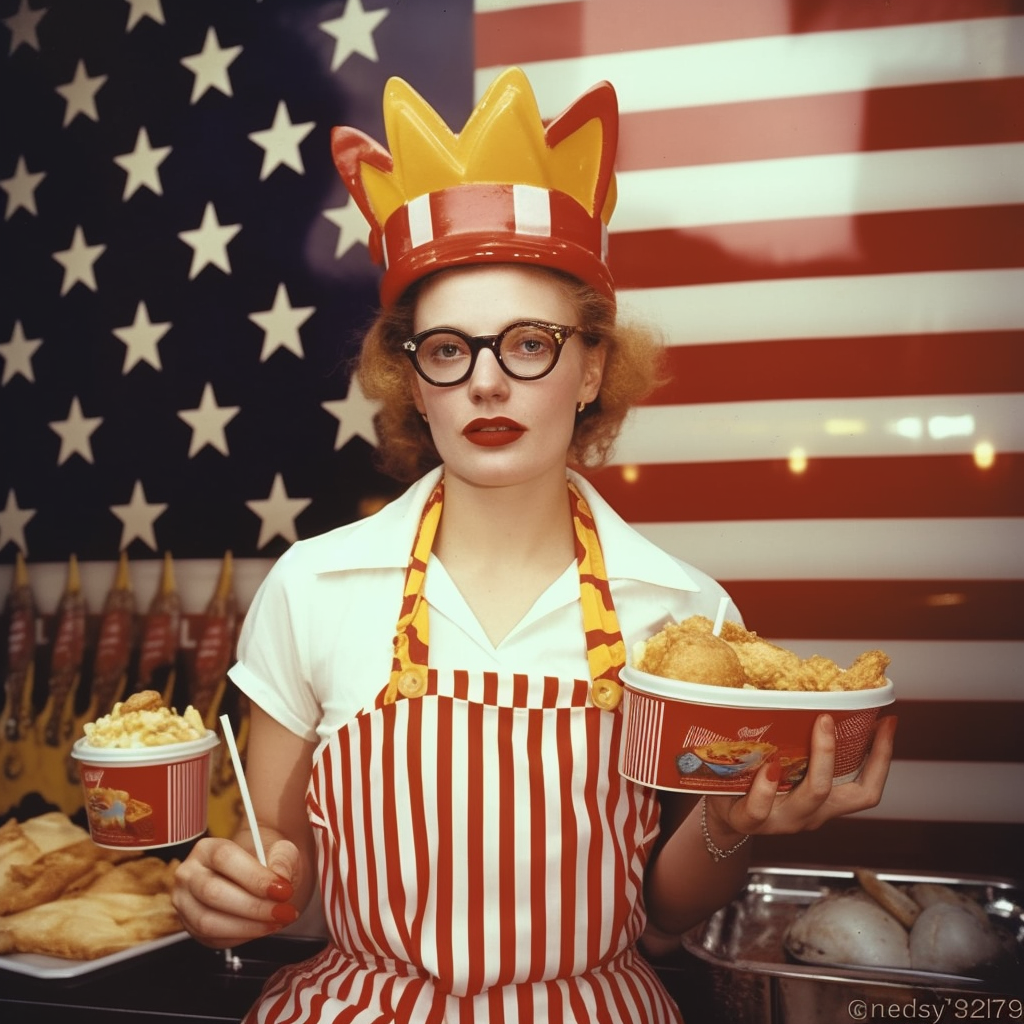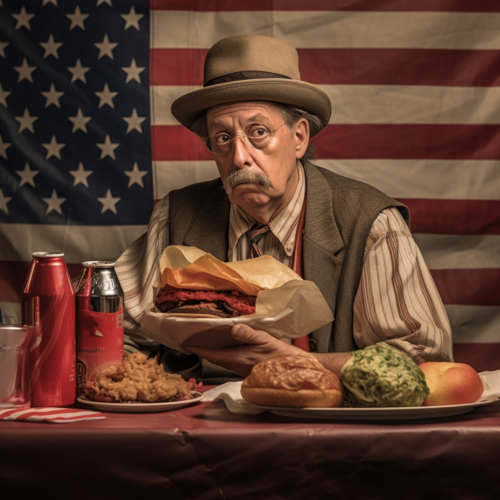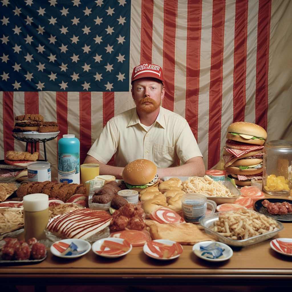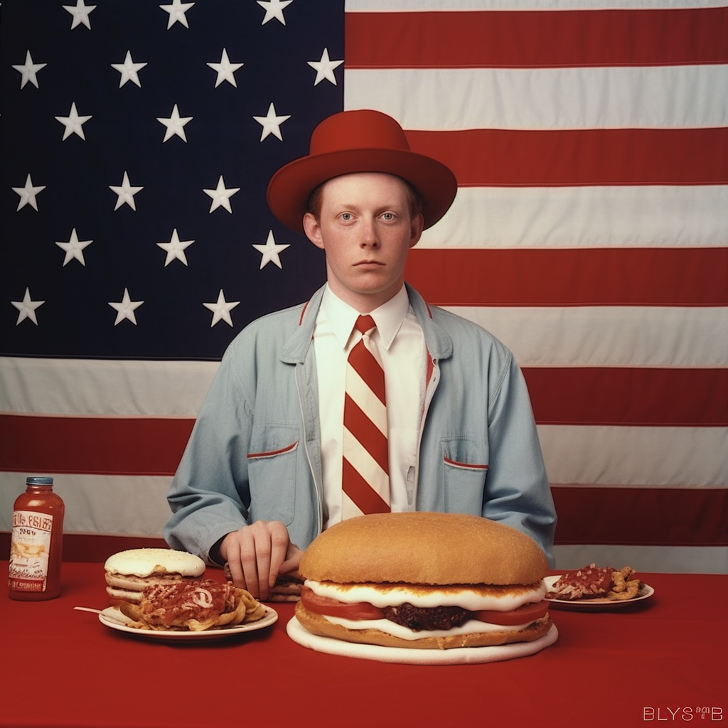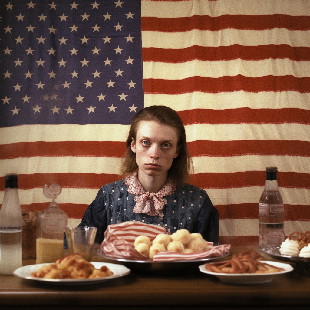 If there’s one thing that’s clear about this exploration it’s that artificial intelligence associates food with Americans, lots of food, really big food, usually fried and sugar-coated food, the AI knows our weakness as a nation. These selections are from hundreds of results where food is a prominent feature of the resulting generation, sometimes the food is the only subject depicted, but frequently a single human is sitting in front of a table loaded with edibles.