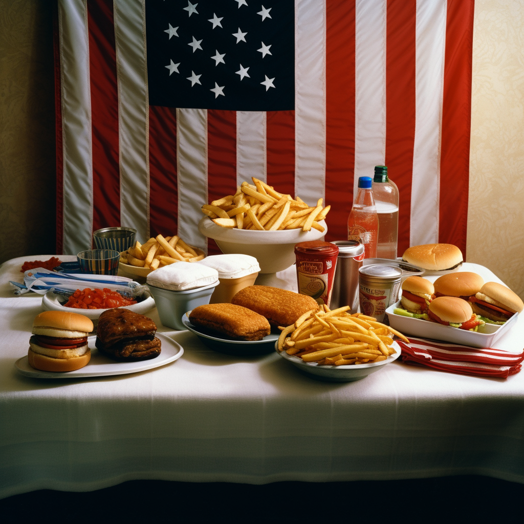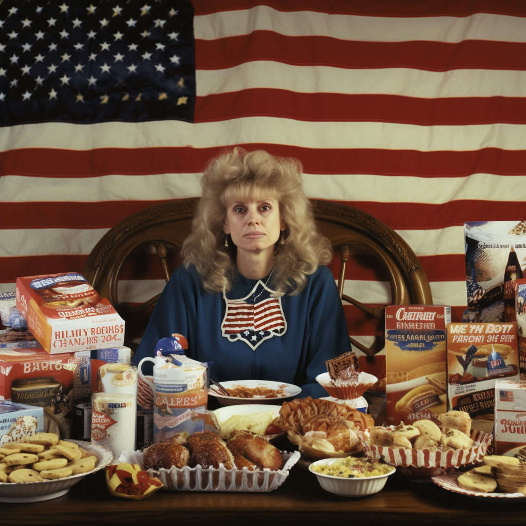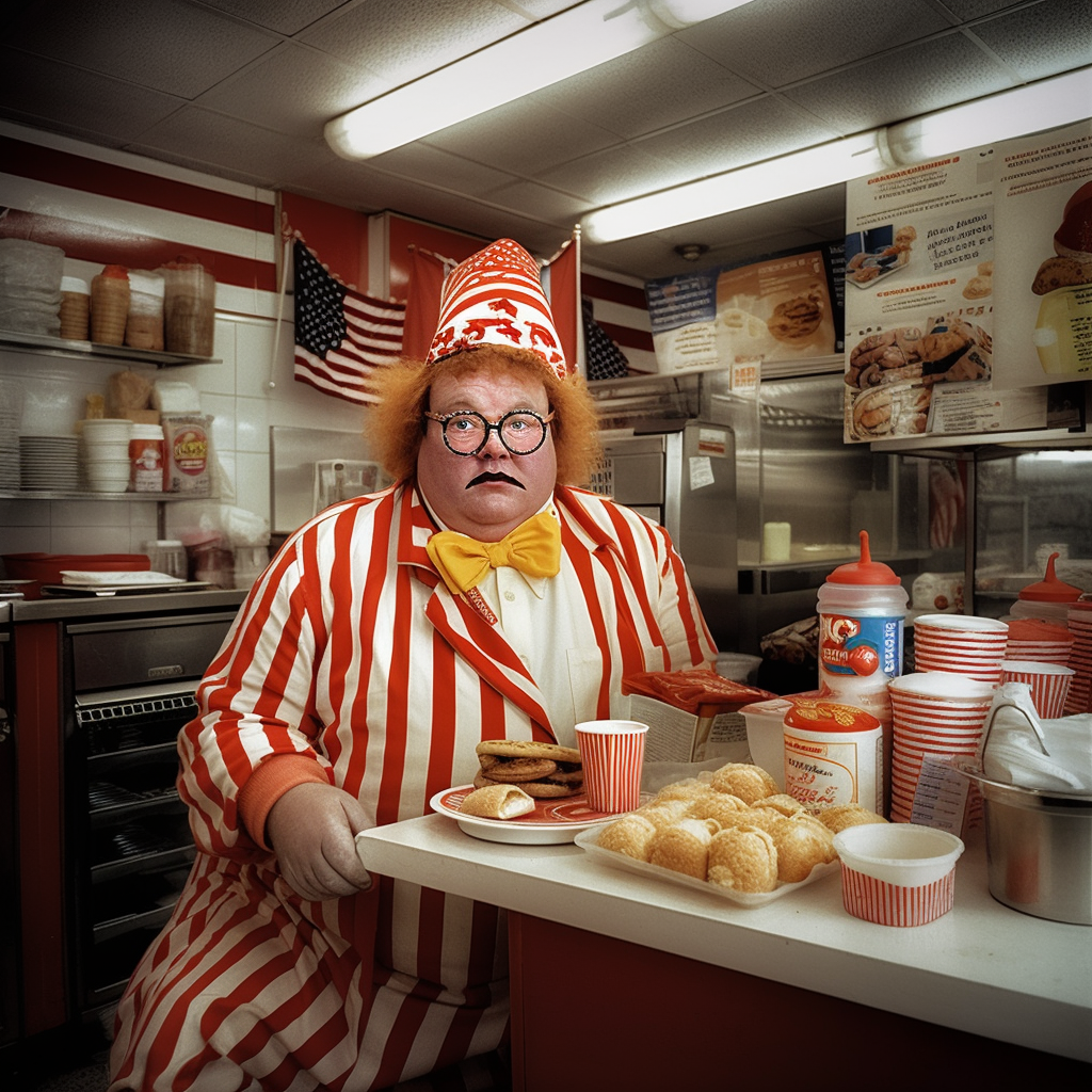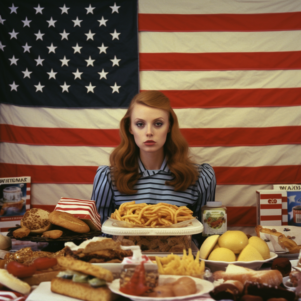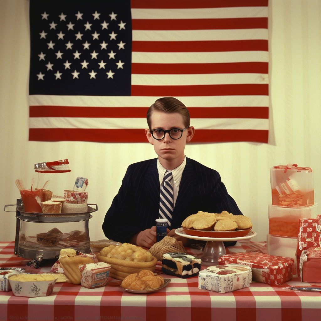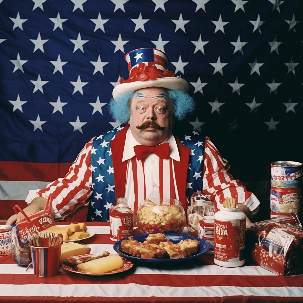 If there’s one thing that’s clear about this exploration it’s that artificial intelligence associates food with Americans, lots of food, really big food, usually fried and sugar-coated food, the AI knows our weakness as a nation. These selections are from hundreds of results where food is a prominent feature of the resulting generation, sometimes the food is the only subject depicted, but frequently a single human is sitting in front of a table loaded with edibles.