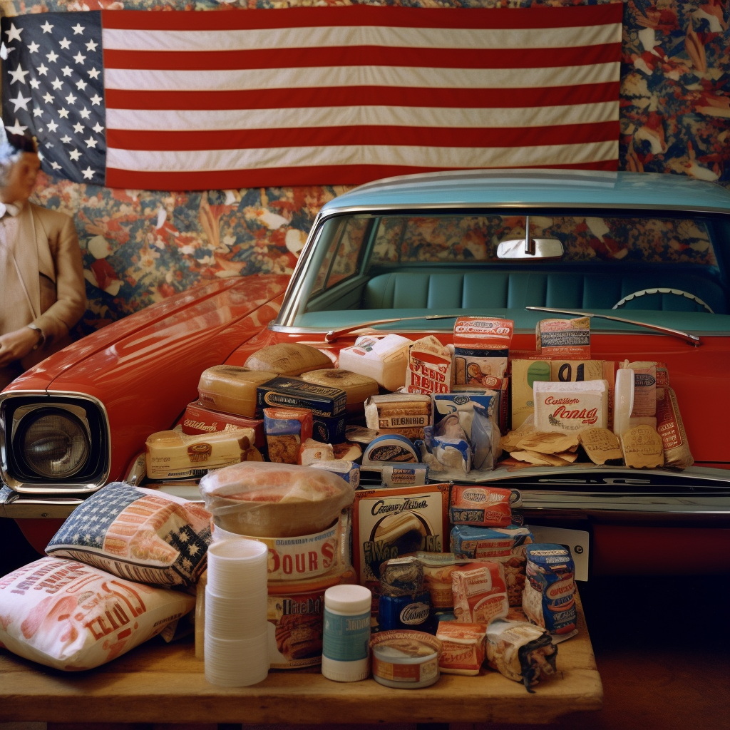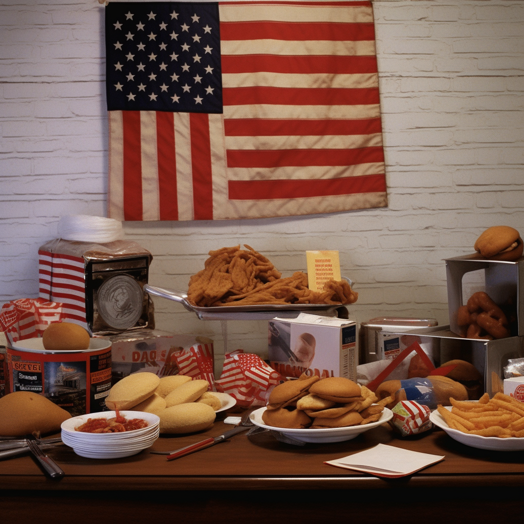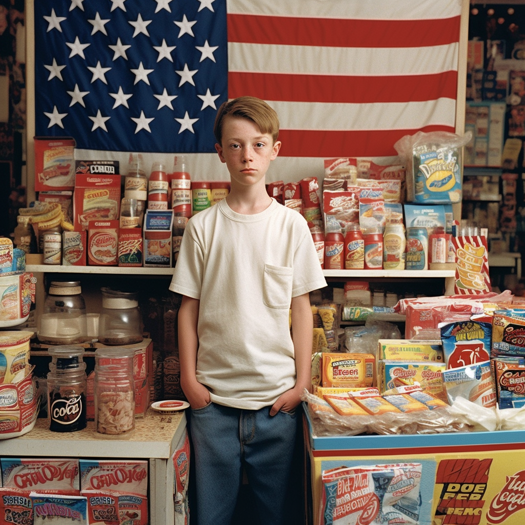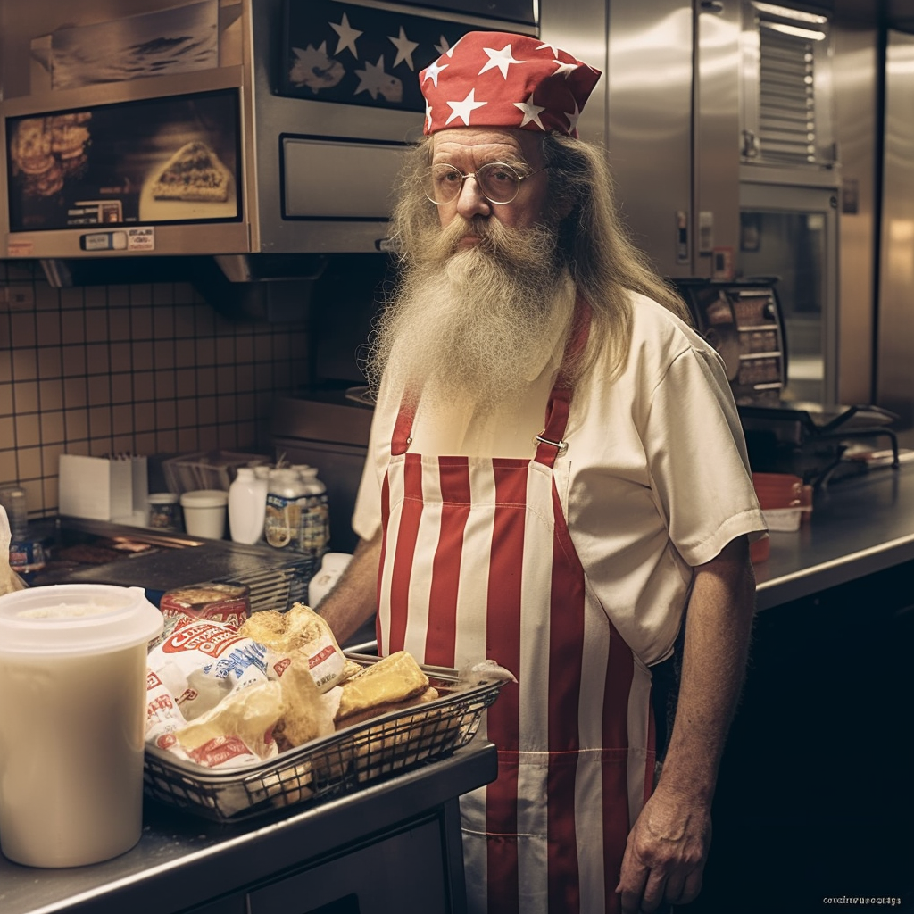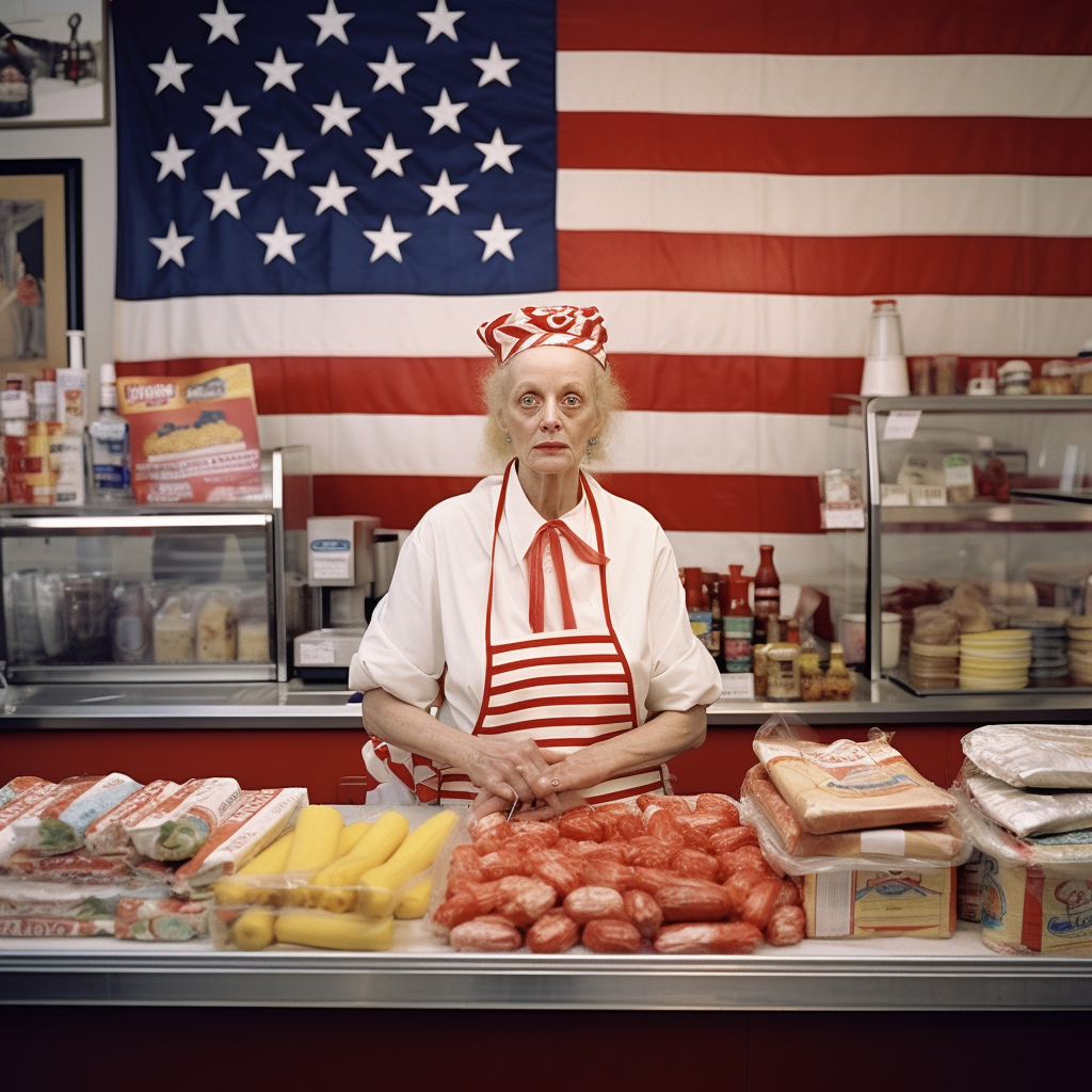 If there’s one thing that’s clear about this exploration it’s that artificial intelligence associates food with Americans, lots of food, really big food, usually fried and sugar-coated food, the AI knows our weakness as a nation. These selections are from hundreds of results where food is a prominent feature of the resulting generation, sometimes the food is the only subject depicted, but frequently a single human is sitting in front of a table loaded with edibles.